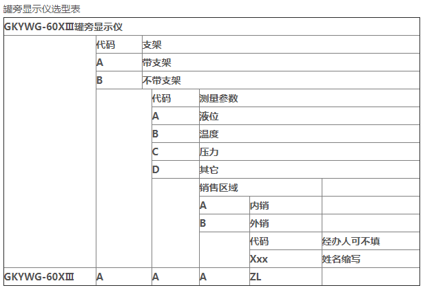 實例:GKYWG-60X Ⅲ罐旁顯示儀(RS485信號),A代表,A代表帶支架,AB代表液位和溫度顯示, A代表內(nèi)銷ZL代表銷售人員為張亮。
