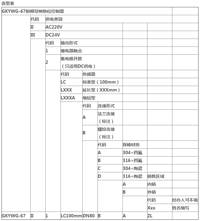 實例:GKYWG-67 II1 LC100mmBAZL , II代表繼電器觸點,1代表繼電器輸出,LC100mm代表標準型,DN80代表法蘭尺寸。B代表316+四氟,A代表內銷ZL代表銷售人員為張亮。